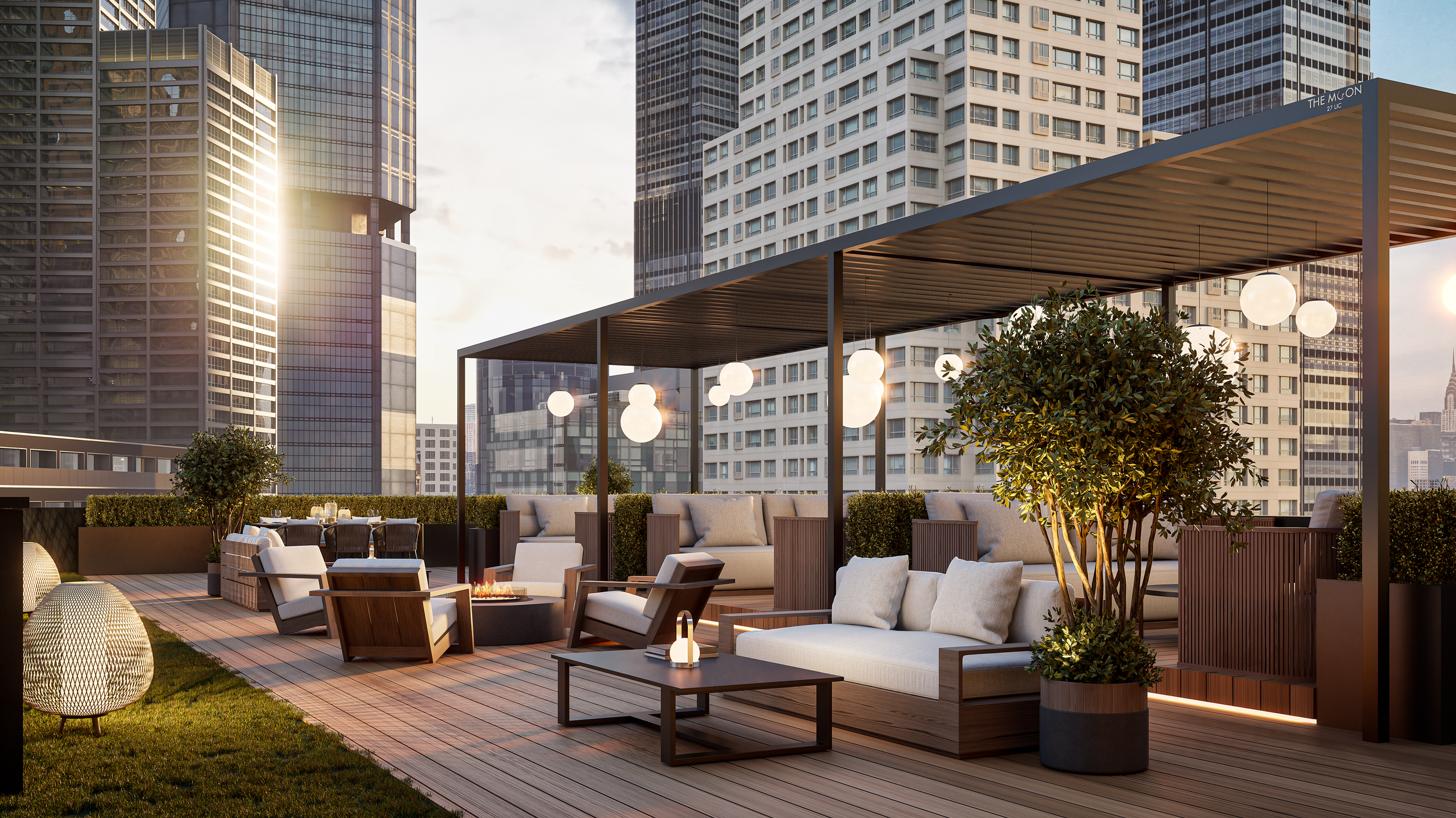 Experience Manhattan from a new perspective. Our landscaped green roof offers panoramic skyline views, framed by a covered pergola lounge and an intimate fire feature gathering area. Whether you're hosting at the indoor-outdoor bar or relaxing in the breeze, the city is your backdrop.