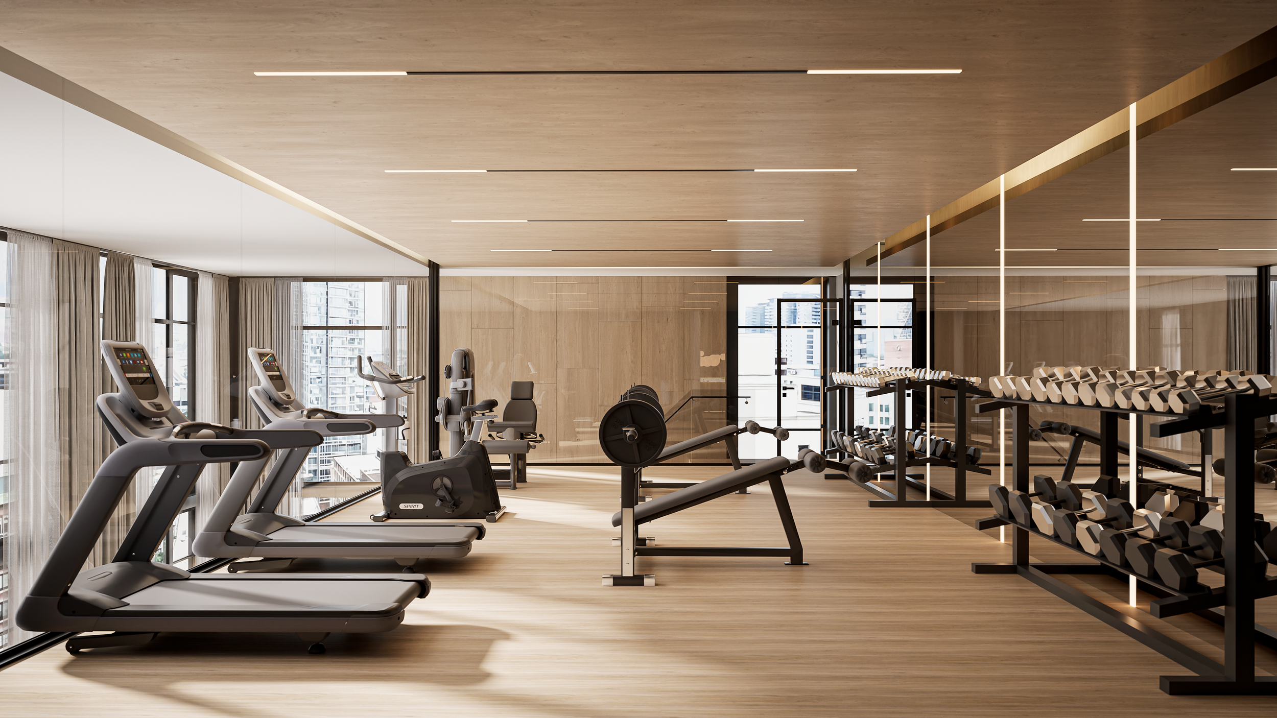 A well-equipped fitness studio brings wellness into everyday life with a calm, modern environment designed for daily exercises and routine.