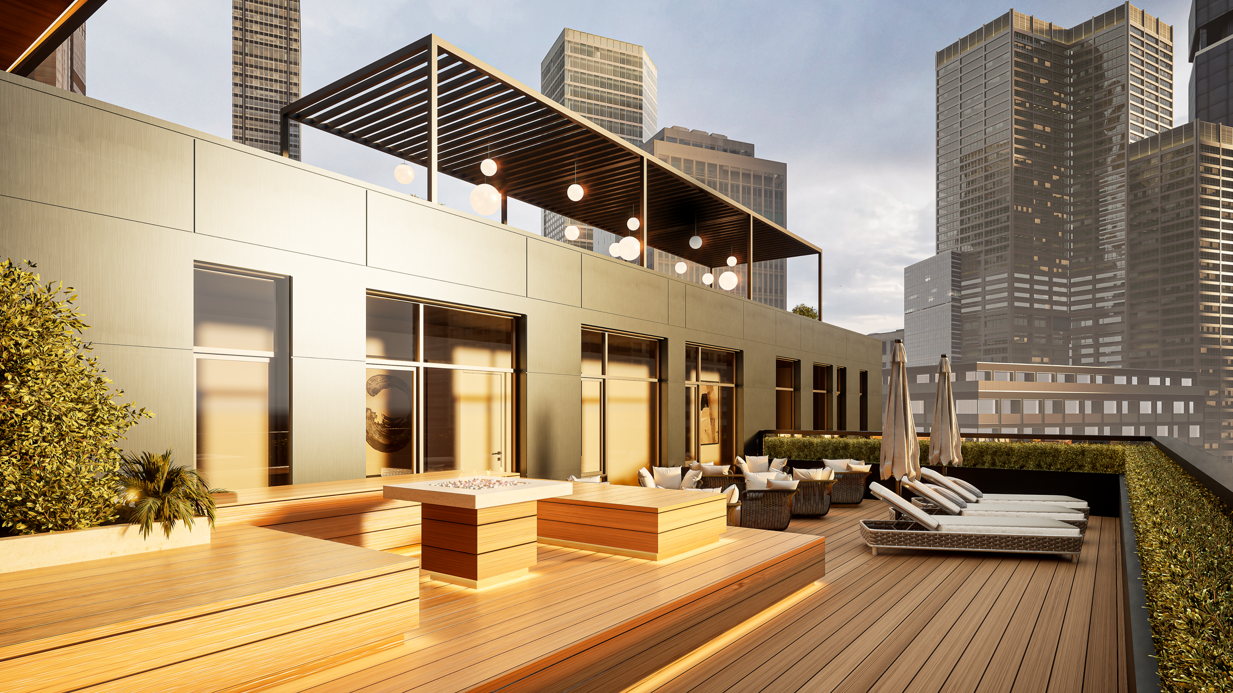 A landscaped rooftop sanctuary with skyline views, a covered pergola lounge, fire feature gathering area, and indoor and outdoor bar spaces creates an elevated setting for relaxation and entertaining.